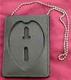 BRPD "cut-to-fit" NECK badge wallet, holds a pin back or wallet clip backed full size badge in a recessed cutout template, clear view pocket for your photo ID on the other side, no outside imprint. 36in rhodium plated beaded chain included.