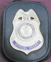 DSS "cut-to-fit" DUTY badge, velcro belt clip, recessed cut-out allows your pin back or wallet clip backed DUTY badge to be protected by leather all around, round shaped, heavy duty spring style clip for belt and velcro inside closure, two brass grommets for use with neck chain (beaded sold separately).