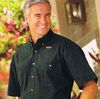 Men's/Unisex sanded long sleeve gabardine. 100% combed cotton, tan gabardine-lined neckband, double-needle stitching, wood-toned buttons. Sizes small - 4XL.