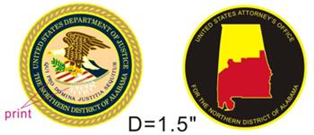 ** SPECIAL "DISTRICT" PRICING EXPIRES 8/1/15 ** - Designed and Produced exclusively for the US Attorney's Office in the Northern District of Alabama, this 1.5in round coin is 3mm thick and features the design inspired by one of our favorite AUSA's in Birmingham. (CLICK ON "Colors" to see image for BOTH sides of this coin. When ordering, choosing EITHER color will order THIS coin. "Mission Statement" & badge version coins available under separate heading. Available for purchase ONLY by authorized NDofAL USAO personnel. Shipping ONLY to NDofAL office for distribution.