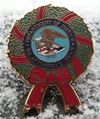 Produced exclusively for the US Attorneys Offices, this custom shaped dyed struck lapel pin features, full color hard enamel, 10K gold plating and a deluxe clutch back. It measures 1.5in tall and 1.0in wide. A whimsical Christmas wreath, complete with holly berries encircles the "Department of Justice - US Attorneys Office" logo. The attachment is a deluxe clutch backing. Available for purchase by all.