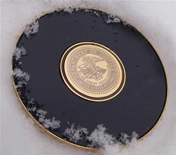 This is one of the NICEST coasters we have ever produced. Solid brass covered with luxurious black leather and a thick cork backing. US Attorney's Office logo laser engraved on the center disk in the middle. Available for purchase by all. (YES, that is snow.)