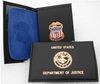 The USMS "COIN/PIN outside imprint" badge wallet is designed to accommodate a 1.5in "challenge coin" or lapel pin. This top grain leather wallet features the "USDOJ" imprint on the outer front flap with text above the logo that reads: "UNITED STATES" and text below that reads: "Department of Justice". There is one clear ID holder that holds a 3x5in FEDCRED, and on the other side is a 1.5in round "cut-to-fit" area for your coin or lapel pin.